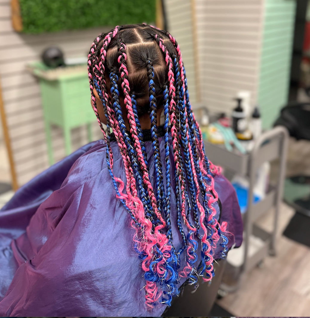 This service includes a gentle cleanse and gentle blow dry to properly prep the hair before braiding. Extension hair is added, with the option to choose curly ends or beads for the finish. Parents provide the beads.