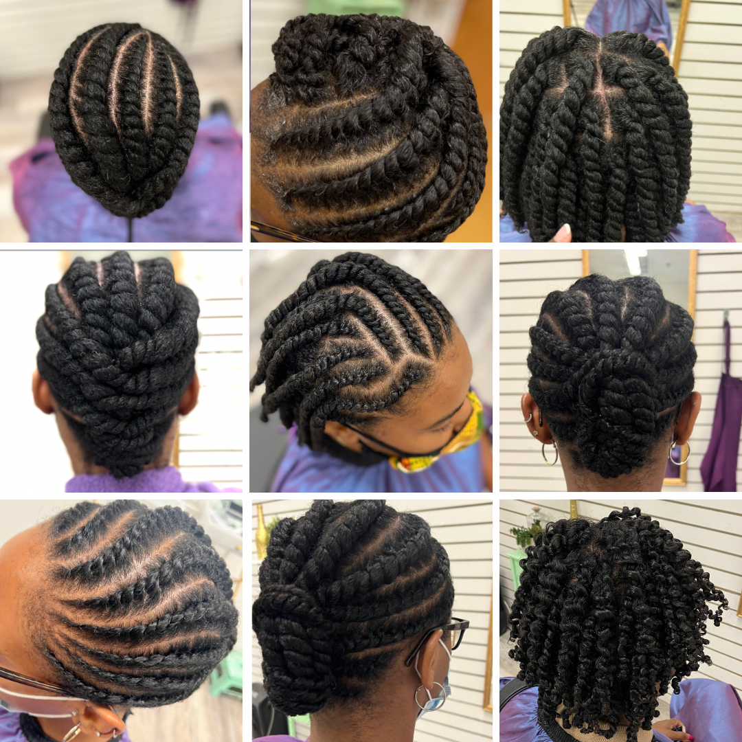 Includes: Cleanse, condition, detangle, two-strand twists or flat twists. This service takes about 90 minutes.